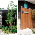 塗り壁前に植えられたスカイロケットが隔離性を生み、駐車スペースをより広く見せています。